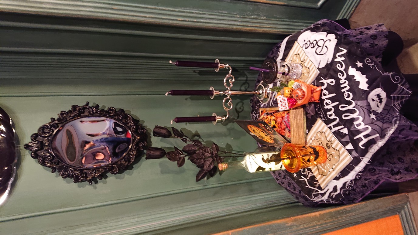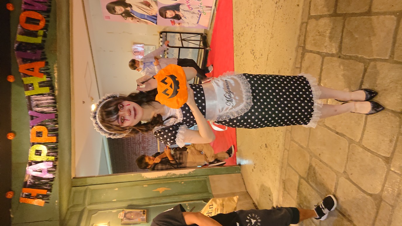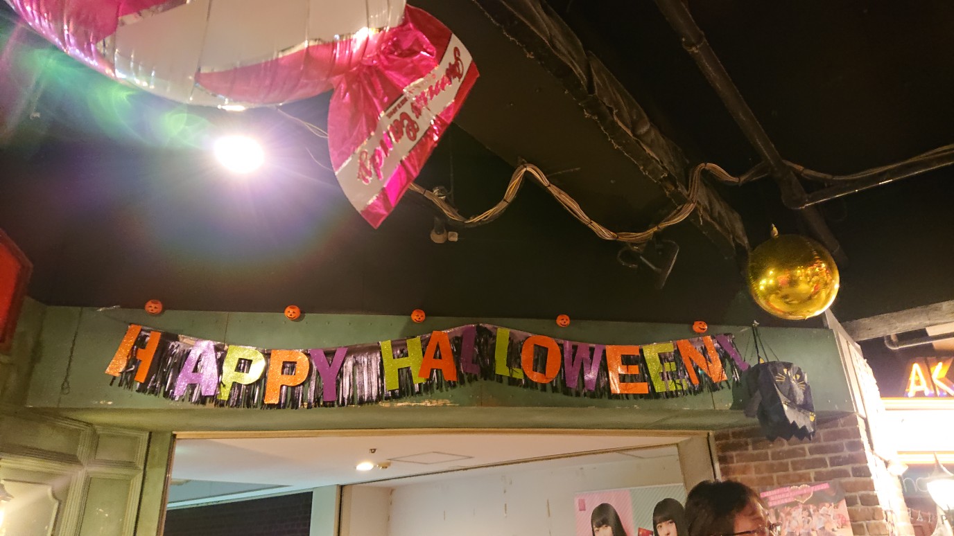 Halloween前夜祭ということもあり、劇場内はHalloweenの飾り付けでした。スタッフさんもみんな仮装です。まずはチケット受付でチケットを受け取りました。真ん中のスタッフさんの仮装がスゴイ気合い入っていました。左右のレジスタッフさんが、この真ん中のスタッフさんにチケットを渡して、そのコが手渡してくれました。(実はこのコが田口愛佳ちゃんだとはこの時、気づかない